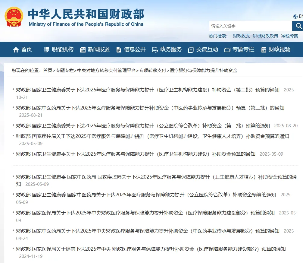 今年以来,财政部已连续下发多批医疗服务与保障能力提升相关补助资金,2025年至今补助资金合计已超过390亿元,展现了国家层面持续强化医疗卫生服务体系建设的坚定决心。
