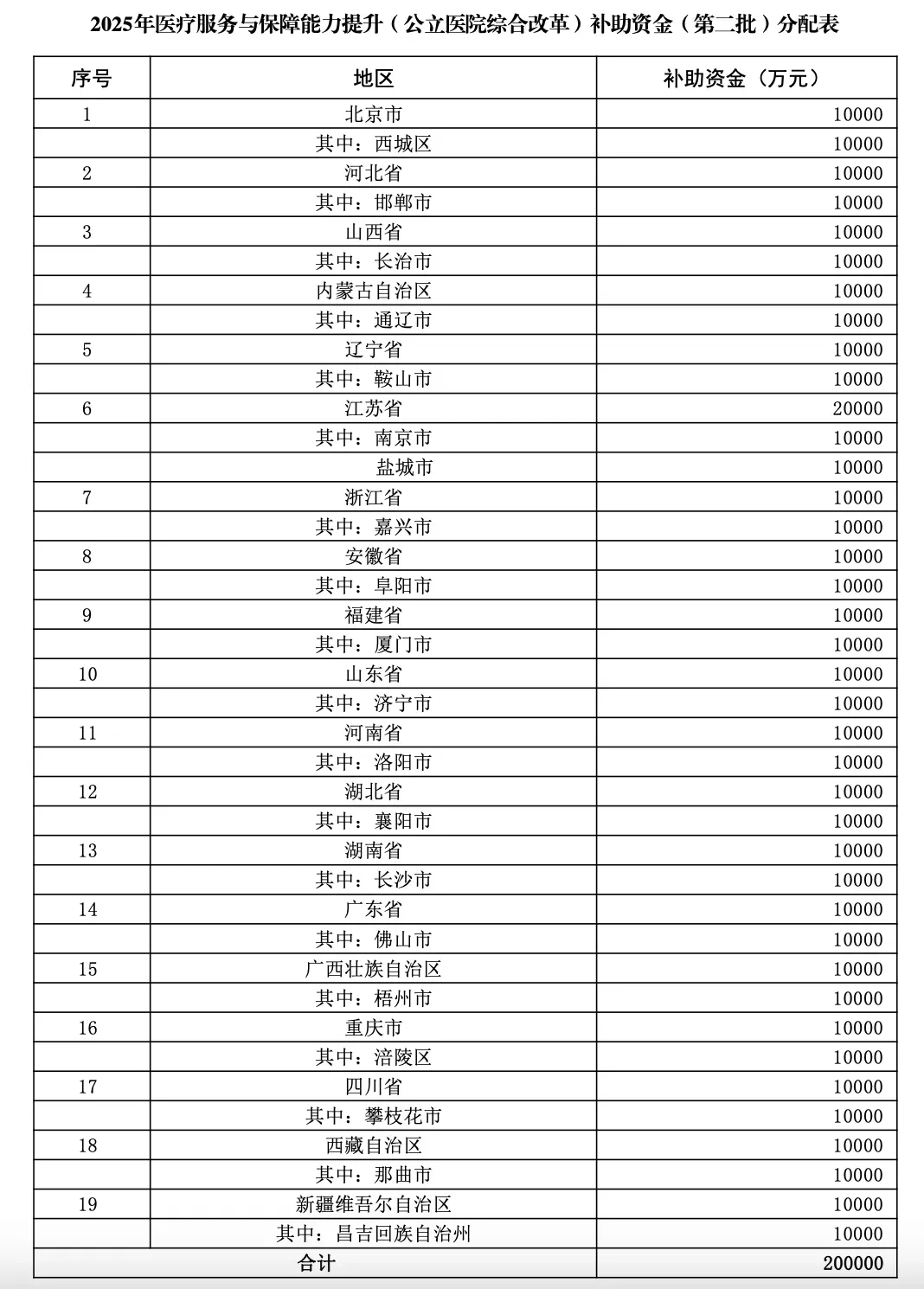 今年8月,“财政部、国家卫生健康委关于下达2025年医疗服务与保障能力提升(公立医院综合改革)补助资金(第二批)预算的通知”发布。根据名单,财政对示范项目补助资金每个1亿元,共20亿中央财政预算下达。