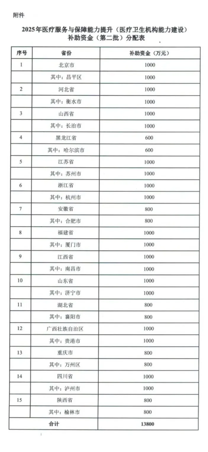 近日,财政部发布“财政部、国家卫生健康委关于下达2025年医疗服务与保障能力提升(医疗卫生机构能力建设)补助资金(第二批)预算的通知”,各地补助资金合计1.38亿元,涉及15个省市。