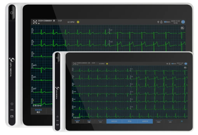 设备体积小巧、配备电容触摸屏,超长续航,支持9导联、12导联、15导联、18导联模式,内置AI-ECG Platform平台,实现AI算法自动分析心电图;同时支持快速身份证/条码信息录入,满足院内外快速诊断需求,可用于远程心电诊断与分级诊疗场景。