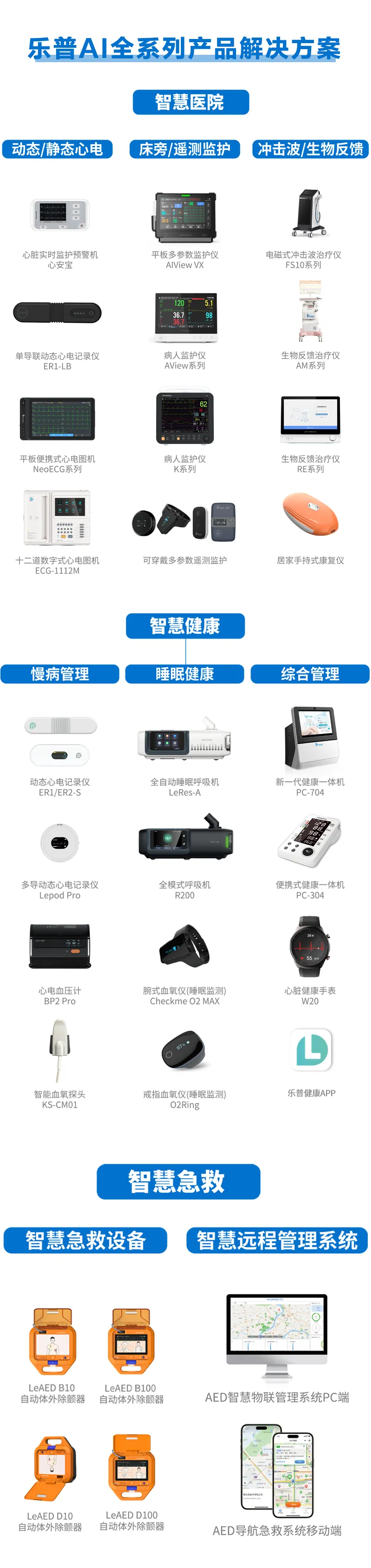 作为AI人工智能医疗科技领域的领军者,乐普医疗 AI 事业部精准匹配基层设备配置需求,可提供冲击波治疗仪、生物反馈治疗仪、AED自动体外除颤器、多参数监护仪、心安宝心脏实时监护预警机、平板式心电图机、健康一体机、血氧仪、心电血压计、心电记录仪等一系列覆盖院内外的优质医疗产品,响应政策指导,为提升基层诊疗效率和质量提供了坚实设备支撑。